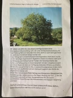 Wir, die Initiative der Bewohner Häge 2, St. Georgen, setzen uns dafür ein, dass dieser prächtige wunderschöne Walnussbaum (Baumumfang: 2,50, der unter die Baumschutzsatzung der Stadt Freiburg fällt) ein Naturdenkmal wird, damit er auch dann geschützt ist, wenn das Grundstück (neben Häge 2) bebaut werden soll.